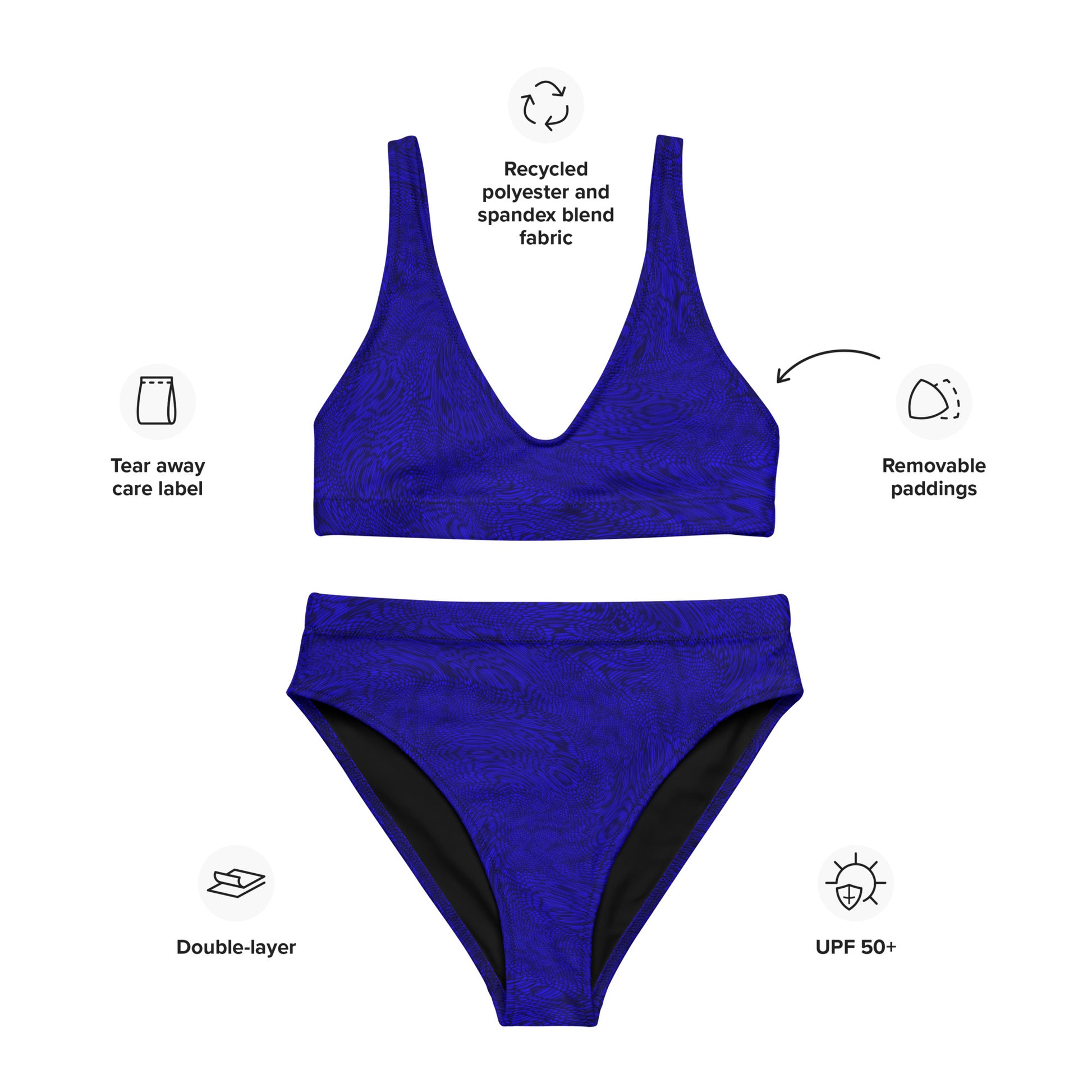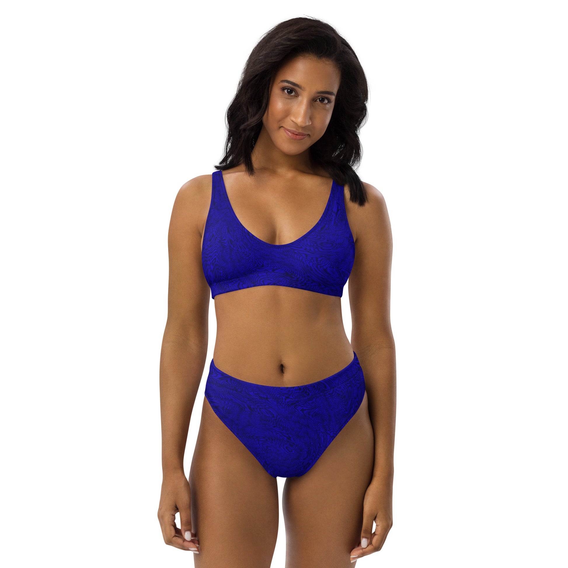 Get ready to feel confident and stunning in this one-of-a-kind blue bikini set. Don't miss out on the opportunity to turn heads and make a statement with this beautiful high-waisted bikini swim suit featuring a mesmerizing fractal pattern and a chic black interior layer. With a lightweight and breathable fabric that feels soft to the touch, this blue bikini is perfect for those hot summer days. Plus, with a fabric composition that includes recycled polyester and elastane, you can feel good knowing that you're doing your part for the environment.