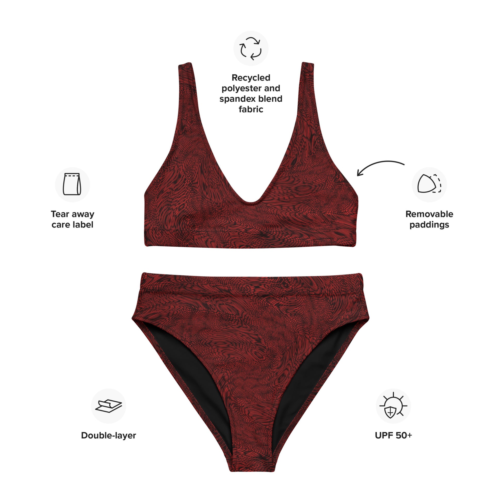 Get ready to feel confident and stunning in this one-of-a-kind blood red bikini set. Don't miss out on the opportunity to turn heads and make a statement with this beautiful high-waisted bikini featuring a mesmerizing fractal pattern and a chic black interior layer. With a lightweight and breathable fabric that feels soft to the touch, this blood red bikini is perfect for those hot summer days. Plus, with a fabric composition that includes recycled polyester and elastane, you can feel good knowing that you're doing your part for the environment.