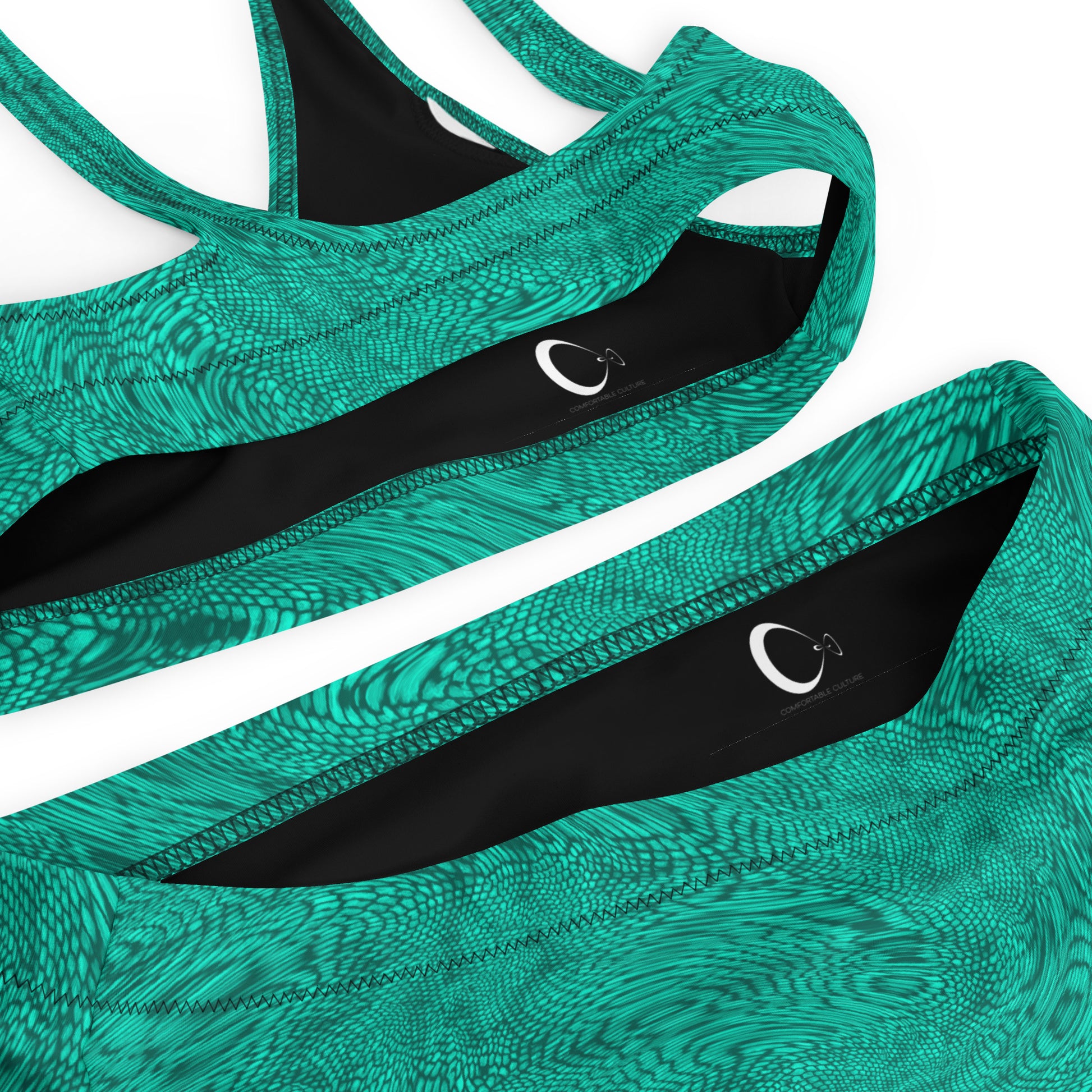 Get ready to feel confident and stunning in this one-of-a-kind teal bikini set. Don't miss out on the opportunity to turn heads and make a statement with this beautiful high-waisted bikini swim suit featuring a mesmerizing fractal pattern and a chic black interior layer. With a lightweight and breathable fabric that feels soft to the touch, this teal bikini is perfect for those hot summer days. Plus, with a fabric composition that includes recycled polyester and elastane, you can feel good knowing that you're doing your part for the environment.