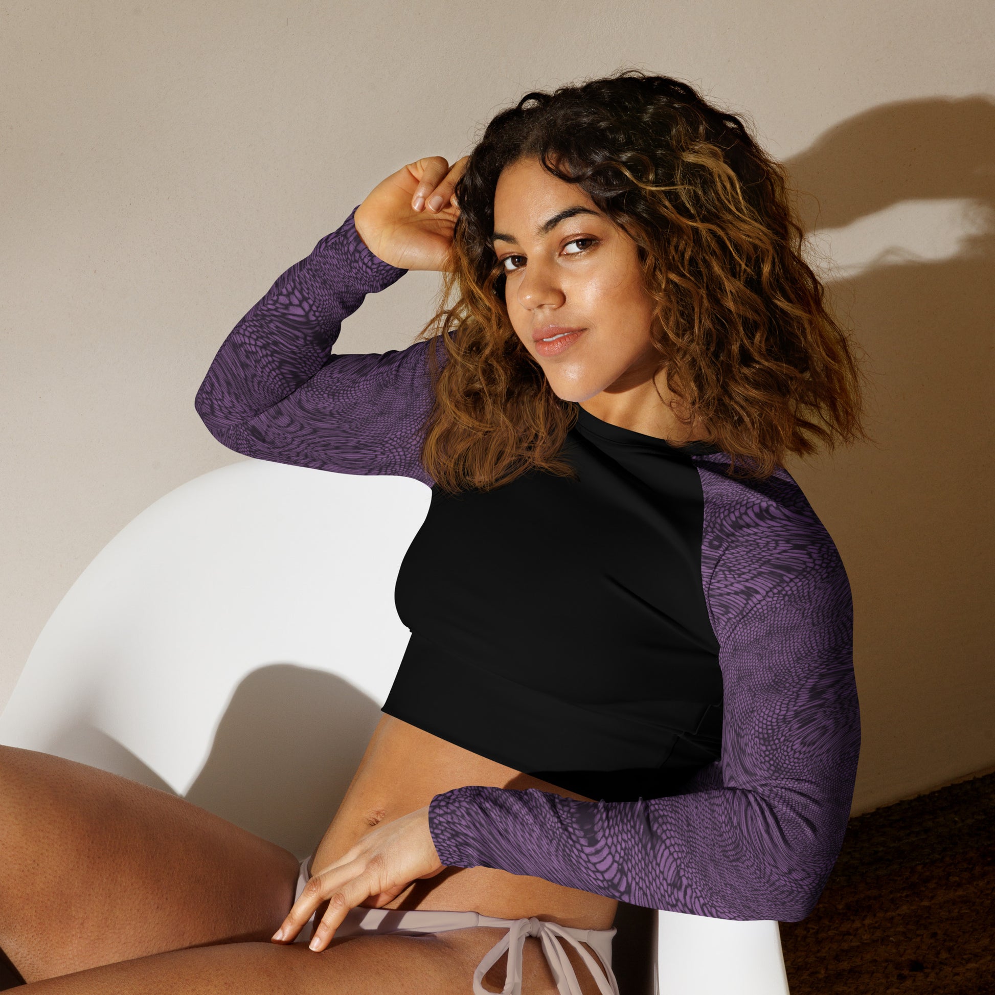 Embrace sustainable fashion with our eco-friendly Fractal Long Sleeve Crop Top, featuring a captivating fractal design on the sleeves and a sleek black body. This versatile crop top is perfect for swimming, sports, and athleisure outfits while making a bold style statement. 🌎💚