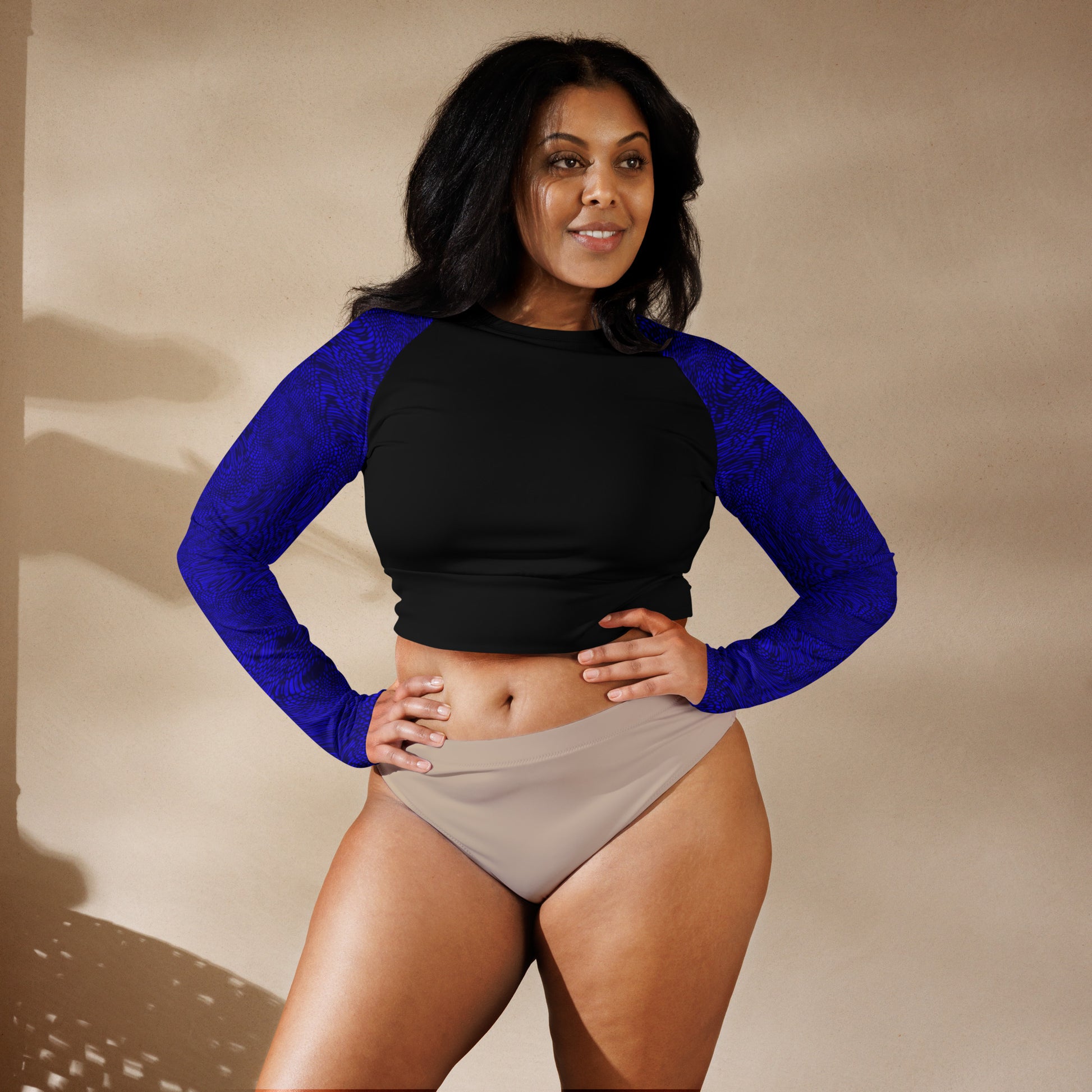 Our blue long-sleeve crop top is crafted from recycled polyester and elastane, making it an environmentally-conscious choice. The UPF 50+ protection, trendy cropped fit, raglan sleeves, and wide, double-layered waistline band ensure comfort and style in any activity.