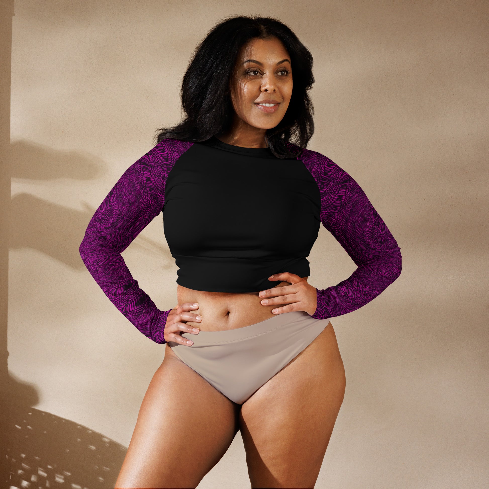 Our magenta long-sleeve crop top is crafted from recycled polyester and elastane, making it an environmentally-conscious choice. The UPF 50+ protection, trendy cropped fit, raglan sleeves, and wide, double-layered waistline band ensure comfort and style in any activity.