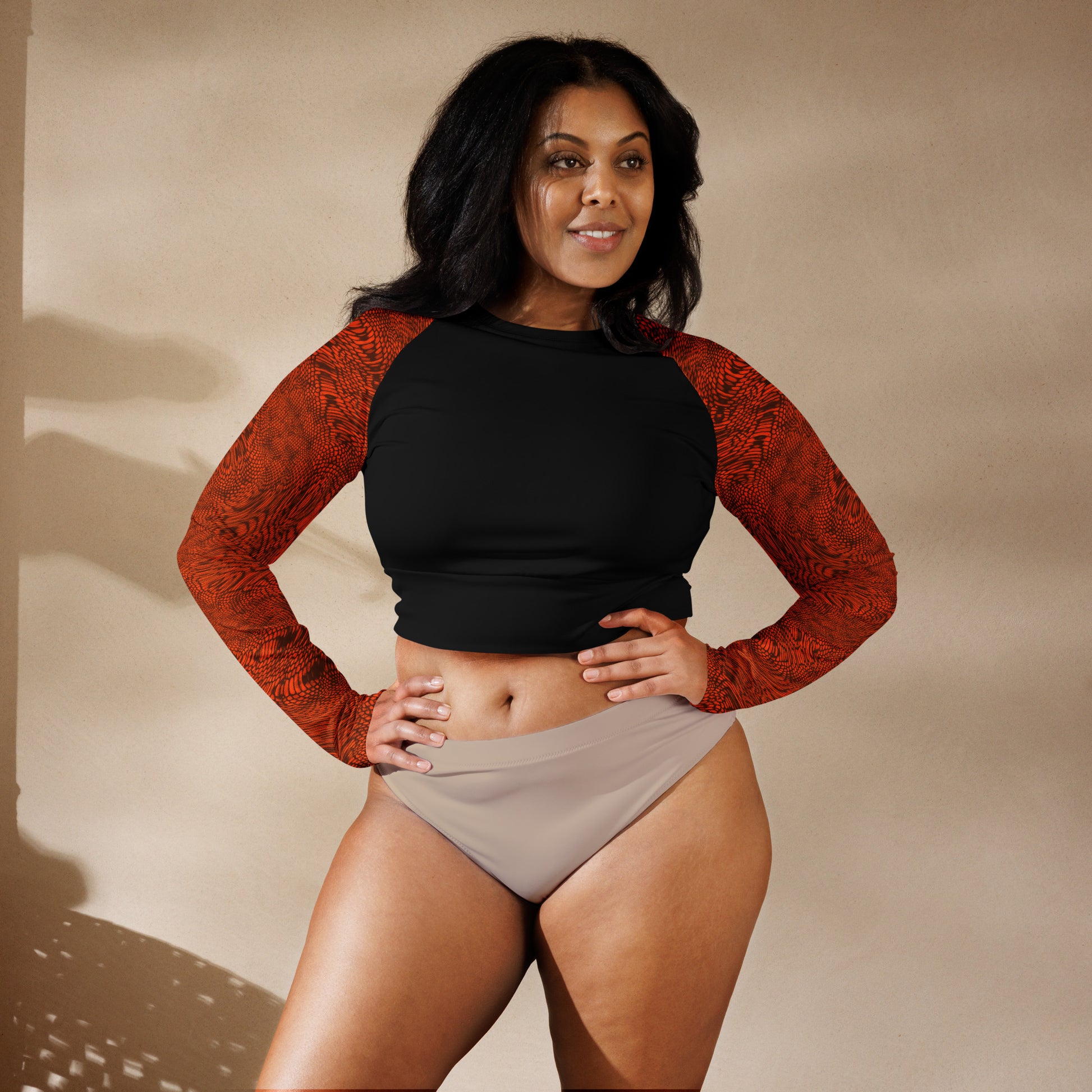 Our orange long-sleeve crop top is crafted from recycled polyester and elastane, making it an environmentally-conscious choice. The UPF 50+ protection, trendy cropped fit, raglan sleeves, and wide, double-layered waistline band ensure comfort and style in any activity.