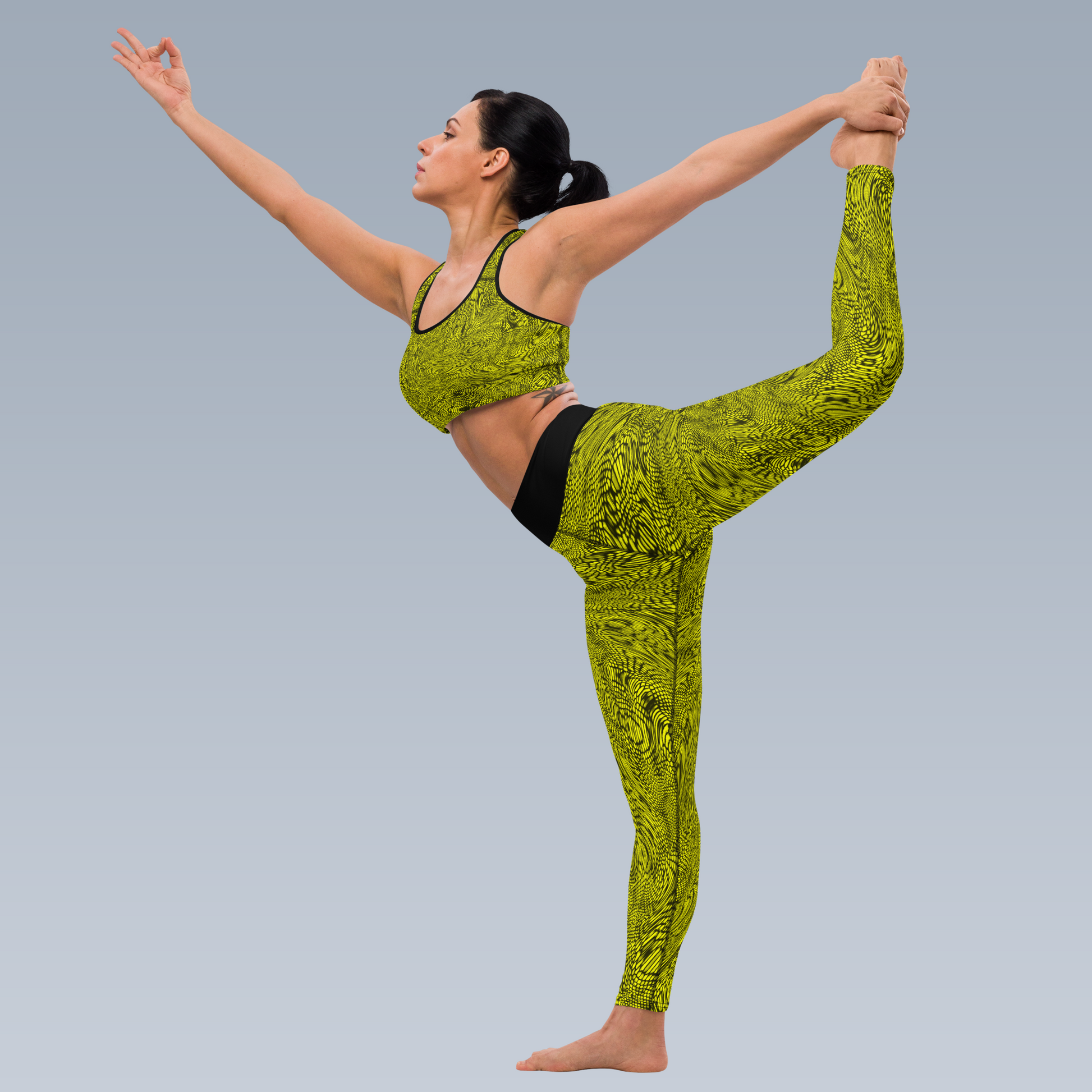 Create a complete, stylish, and functional ensemble by pairing this yellow sports bra with our matching yellow leggings (sold separately). Both items showcase the same head-turning fractal design and are crafted from premium materials for maximum comfort and support.
